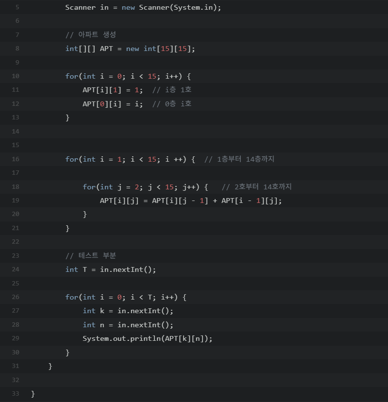 https://www.acmicpc.net/problem/2775 2775번: 부녀회장이 될테야 첫 번째 줄에 Test case의 수 T가 주어진다. 그리고 각각의 케이스마다 입력으로 첫 번째 줄에 정수 k, 두 번째 줄에 정수 n이 주어진다. (1 <=..