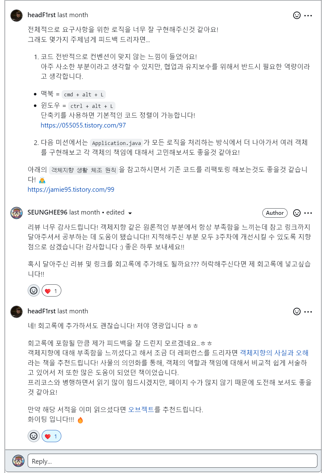 시간이 없어서 다른 분의 피어리뷰를 드리지 못한 채 제 PR을 일단 올렸는데, 돌이켜보니 기본적인 코드정렬도 되어있지 않고 객체지향 체조 원칙까지 지키지 못한 초심자에게 너무 과분한 리뷰가 달렸다 :)